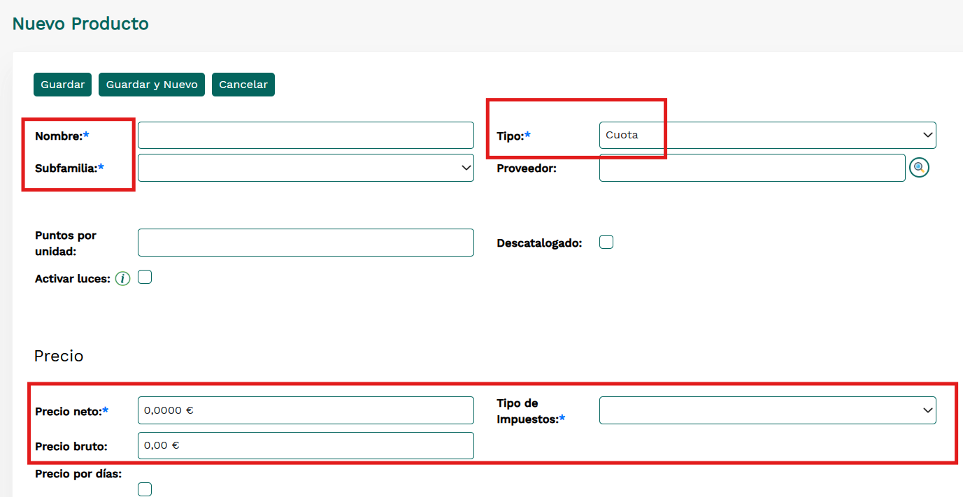 Precio Bruto: Poner el precio de venta al público de la cuota.