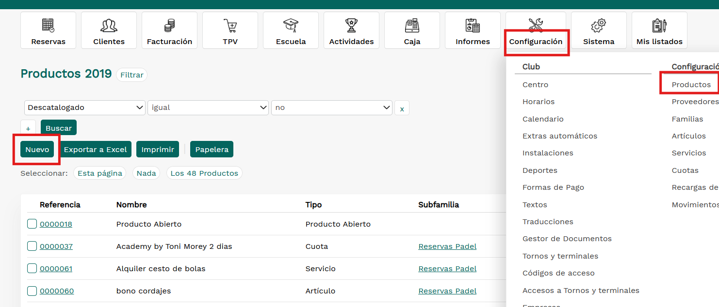 En el programa los productos pueden ser de tres tipos (artículos, servicios y cuotas).